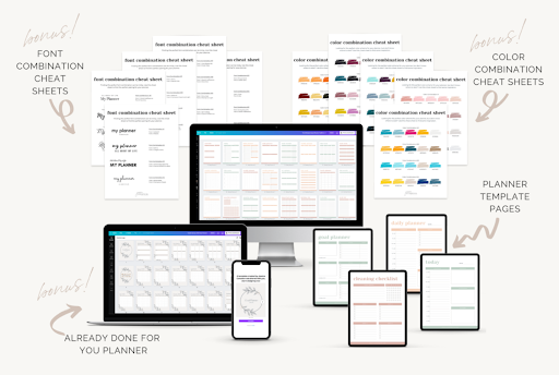 The Ultimate Canva Planner Toolkit contains everything entrepreneurs need to create stunning planners, build a catalog of products, and stand out from the competition. It includes more than 100 fully editable planner template pages explicitly designed for use in Canva’s free version and Canva Pro.