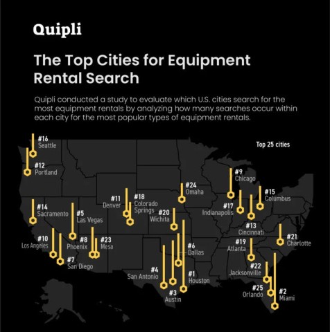 Quipli pinpointed which cities in the U.S. search most via Google for construction equipment rentals – an indicator of where the biggest markets are right now.