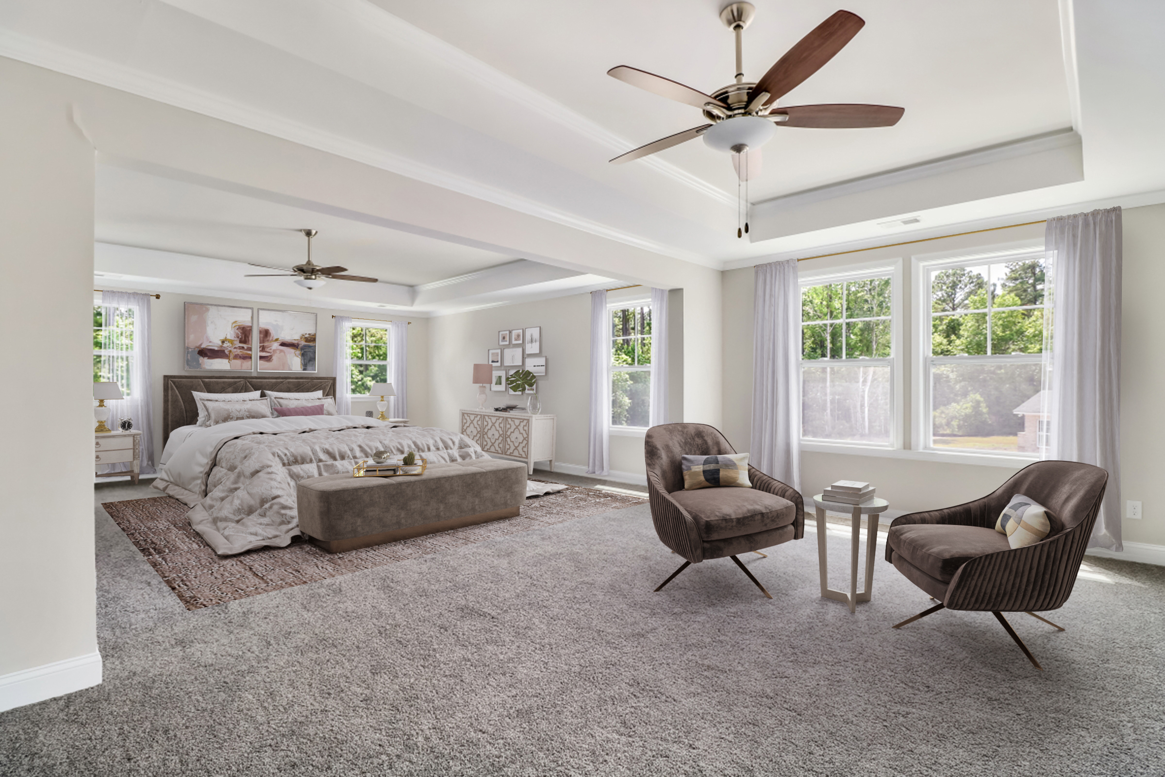 Creating a cozy seating area within the bedroom can enhance its functionality. Add a comfortable chair or a small sofa where a person can sit and relax, read a book, or enjoy a cup of tea. This seating area provides a separate space for relaxation and adds a touch of luxury to the room. Landmark 24 Homes. will help each client create a home that meets their needs, one that allows for this seating area in the bedroom.