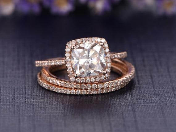 Right now, special spring prices are available on a wide range of rings at AGemZ including the Classic Art Deco 1.50 Carat Oval Cut Moissanite Diamond Trio Wedding Ring set in 10k White Gold and the Halo 2 Carat Cushion Cut Moissanite Diamond Trio Engagement Ring Set in 10k Rose Gold.
