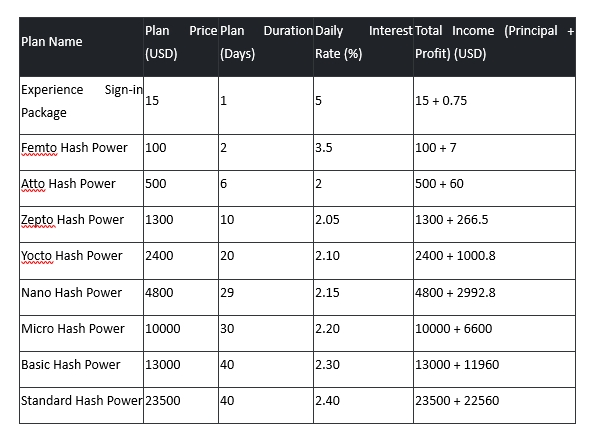 Choose your package: Different mining options are available, from short-term plans to long-term packages, with investment ranges to match your investment goals and capabilities.