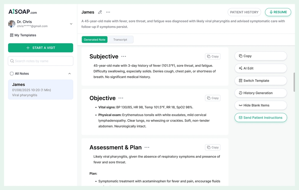 AI-Generated SOAP Notes: Automates medical documentation with structured and detailed SOAP notes.