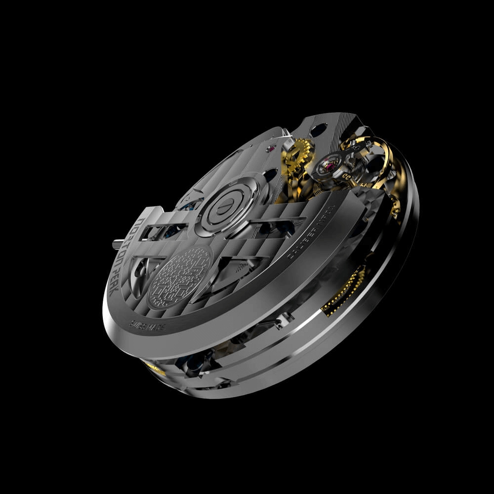 The NP Chrono 43, Norton Peak’s inaugural model, encapsulates this vision with striking clarity. Designed in Valais and machined and assembled in Biel/Bienne, the chronograph is engineered for a perfect balance of lightness, robustness, and performance. Its case is crafted in grade 5 titanium, a material renowned for its exceptional strength-to-weight ratio, ensuring the watch remains remarkably lightweight while highly resistant to shocks and wear. Sapphire crystal on both the front and the caseback adds crystalline purity and outstanding durability, hallmarks expected at the highest level of Swiss watchmaking.