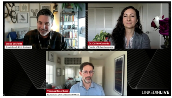 In the LinkedIn Live session, Eckfeldt, Corrado, and Rosenberg explored what happens when leaders try to drive transformation without addressing what is happening in their own nervous systems. They discussed the gap between aspirational values on the wall and the lived experience of people in meetings, and how embodied leadership practices can help close that gap.